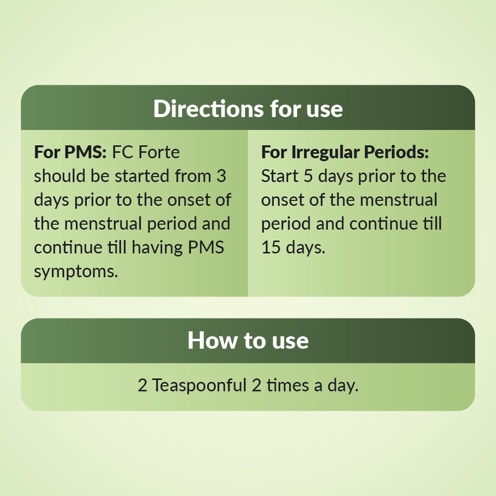 FOR PMS: FC Forte should be started from 3 days prior to the onset of the menstrual period and continue till having PMS Symptoms. For irregular periods: start 5 days prior to the expected menstrual period dates and continue till 15 days.