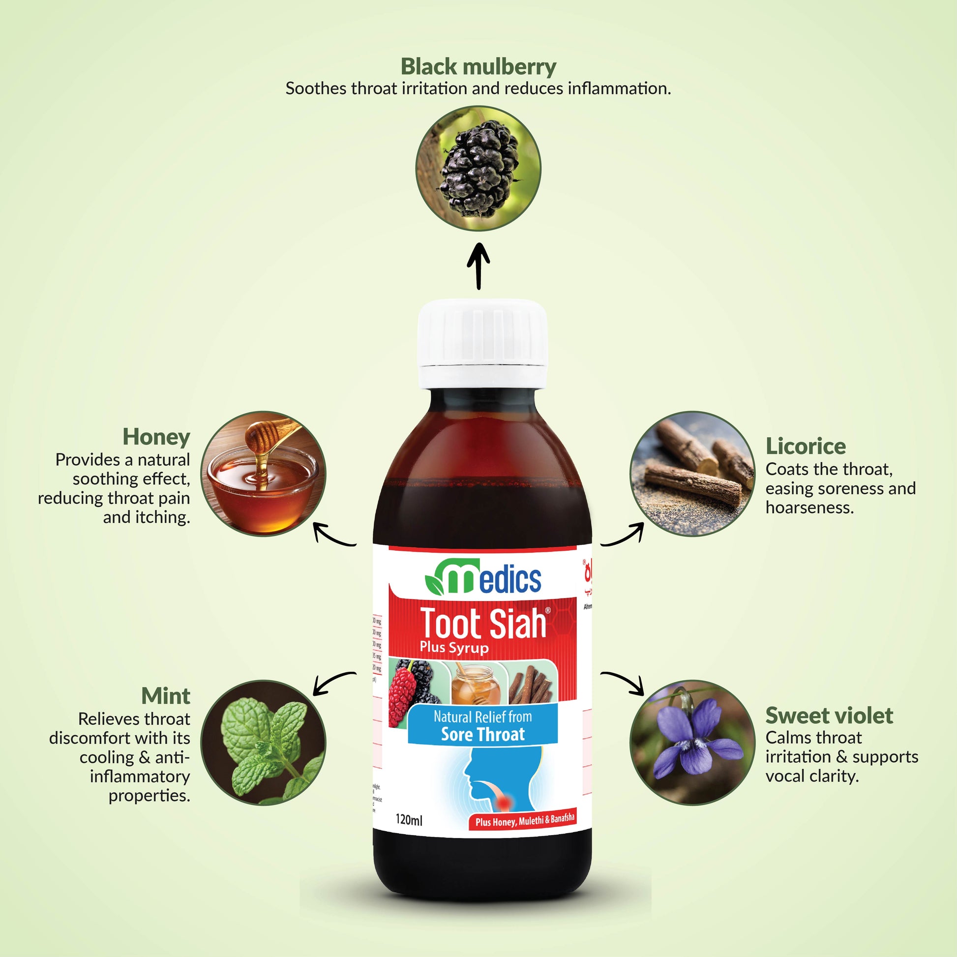 Medics Toot Siah Plus formulated with Black Mulberries(Tootsiah), Honey(Shehad), Licorice(Mulethi), Viola(Banafsha) and Mint(Podina) for a naturally soothing relief from sore throat and inflammation. It is a unique combination of 5 powerful natural ingredients with proven effectiveness. They help soothe the throat, reduce pain and swelling, and clear mucus to relieve cough